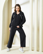 Black with white stripe, Athleisure set, Sporty zip-up, Relaxed fit pants.