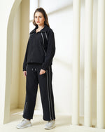 A two-piece black athleisure set featuring a cropped zip-up top with a high neck and matching relaxed-fit pants. Both pieces are accented with white piping/stripes for a sporty, elevated look.