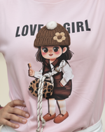 This is the perfect casual and cute t-shirt! Made from soft, breathable cotton in a lovely pink shade, it features an adorable "LOVE GIRL" graphic print of a sweet doll in a beanie. It's comfortable, stylish, and pairs perfectly with your favorite jeans or white trousers.