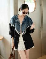 A cutting-edge, hybrid statement jacket that merges the classic denim trucker style with a sporty bomber/varsity design. It features a cropped denim upper section with a hood and is seamlessly joined to a longer, contrasting black fabric lower body and puff-sleeves that include athletic stripe trim. This piece offers a chic, layered look in a single garment, perfect for an edgy, stylish outfit.