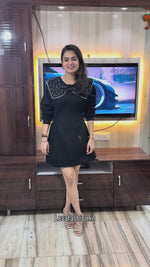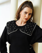 Inject some luxe detail into your casual wardrobe with this black mini-dress. It features a show-stopping oversized, contrasting collar richly embellished with multiple rows of faux pearls/studs. Made from a comfortable sweatshirt-style, this dress has a relaxed fit and subtle D-ring waist detailing for a touch of shaping. A perfect blend of comfort and high fashion for a striking mod or streetwear look.