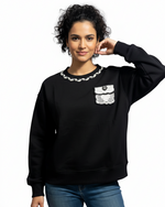 This comfortable black crewneck takes casual wear to a new level. The oversized sweatshirt features a decorative, white mesh faux pocket on the chest, bordered by intricate pearl and bead embellishments. The neckline is also trimmed with small pearls, giving this cozy fleece-lined top a unique, luxury streetwear feel. It's an easy way to add glamour to your casual look.