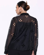 Black solid self design semi sheer Casual shirt, has a spread collar, button placket, na pocket, long puff sleeves, curved hem