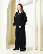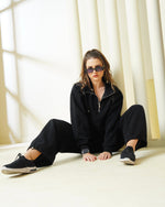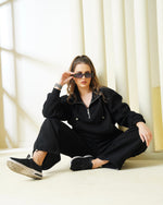 Achieve effortless street style with this comfortable black athleisure set. The outfit includes an oversized quarter-zip sweatshirt with a sporty funnel neck and matching wide-leg joggers for a modern, relaxed silhouette. Made from soft, cozy fleece material, this versatile two-piece is perfect for travel, lounging, or chic, monochromatic casual wear.