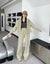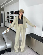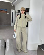 A comfortable two-piece tracksuit in a trendy, neutral taupe or pale beige color. It features a zip-up jacket and wide-leg matching pants, offering a fashionable and relaxed fit.