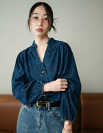 A chic dark indigo denim blouse with a flattering V-neckline and a tailored Mandarin-style collar. It features full, voluminous sleeves cinched at the wrist and simple gold-tone buttons, making it a sophisticated, dressier take on a denim top.