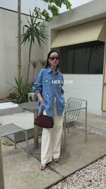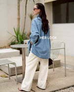 A stylish oversized light blue denim shirt decorated with simple, fuzzy embroidered flower patches. The relaxed fit and airy light wash make it perfect for warmer weather layering or a soft casual look.