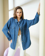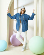Achieve an effortless layered look with this stylish Hooded Denim Shacket. This versatile piece combines a classic medium-wash denim shirt with a built-in grey jersey hood, giving you a sporty, streetwear vibe without the bulk of extra layers.