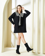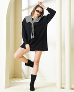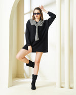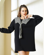 Channel a cute, nautical vibe with this Black Sailor Collar Dress. This cozy sweatshirt-style tunic features a statement black and white striped collar that extends into a stylish front tie, adding a preppy touch to a classic black silhouette.