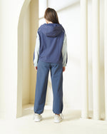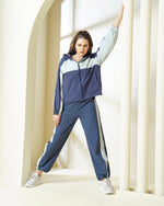 A sporty and comfortable two-piece tracksuit featuring a color-block design. The zip-up jacket and matching pants are primarily navy blue with contrasting light gray/blue panels on the hood, shoulders, and legs. The jacket has a hood, full zipper, and functional side pockets.